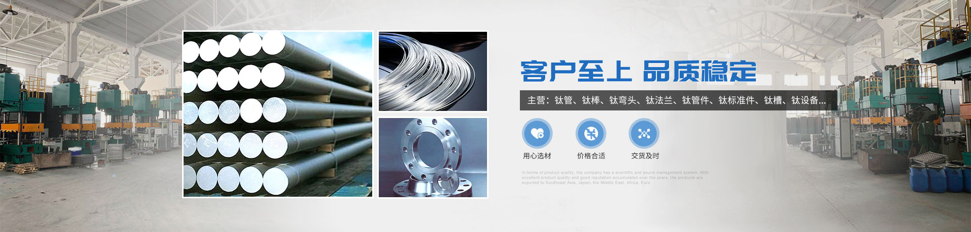 本公司的主营产品钛制品有,钛管,登录入口,钛弯头,钛法兰,钛管件,钛标准件,钛槽,钛设备,钛冲压弯头等。所生产各种规格的钛制品主要运用于化工、电镀、石油、电子、环保、海洋等领域"以质量求生存,靠优服求发展“为宗旨,客户的满意是我们永恒的追求,欢迎各界用户来函来电,传真,洽谈贸易。